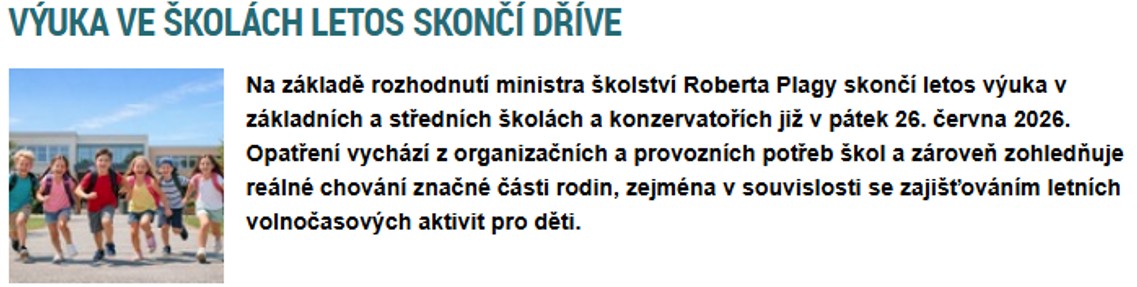 oproti plánovanému ukončení školního roku ke dni 30. června 2026, rozhodl pan ministr Robert Plaga o zkrácení tohoto školního roku 2025/2026, který bude končit již v pátek 26. června 2026. Více níže.