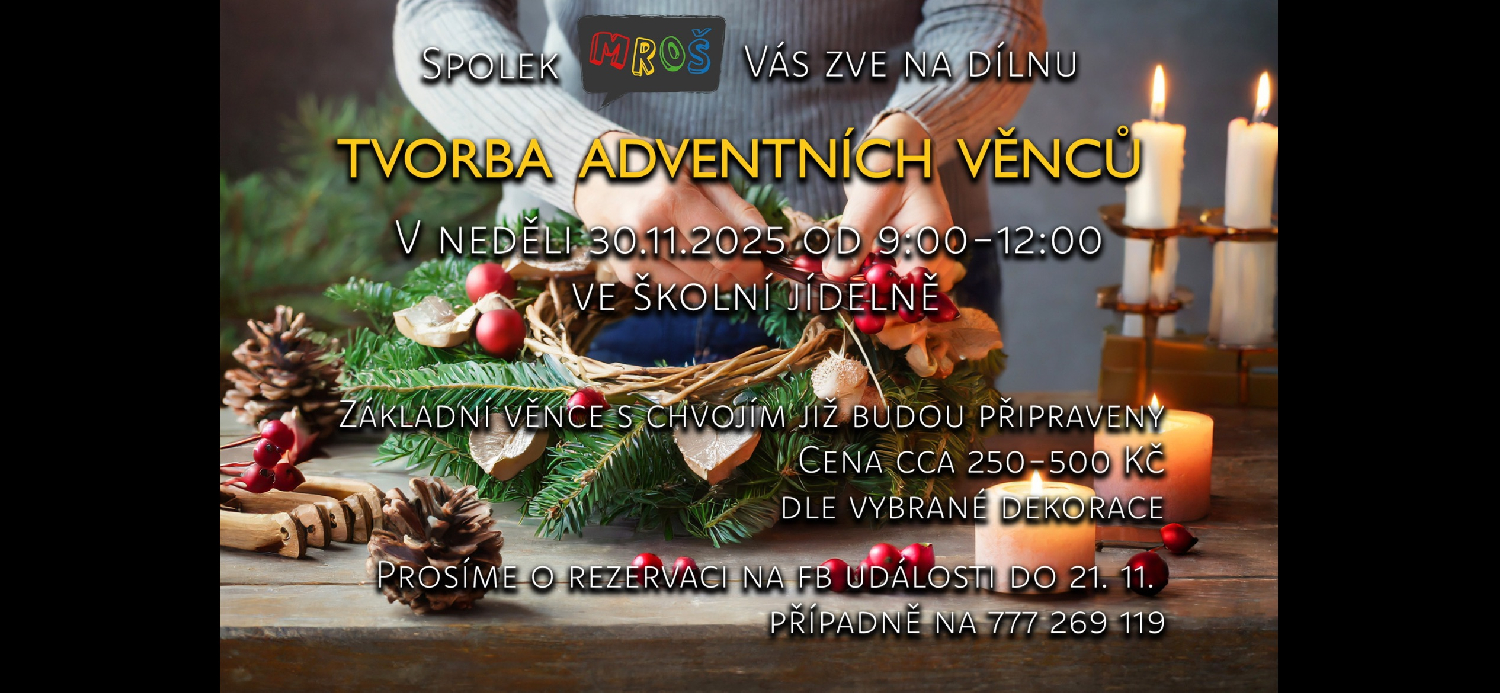 30. listopadu 2025Adventní věnce s MROŠemOpět po roce Vás zveme 1. adventní neděli, tj. 30. 11. 2025 od 9:00 do 12:00, na aranžování adventních věnců se spolkem MROŠ. Dílna bude probíhat v jídelně naší základní školy. Prosíme o včasnou rezervaci. Více zde. Těšíme se na všechny!