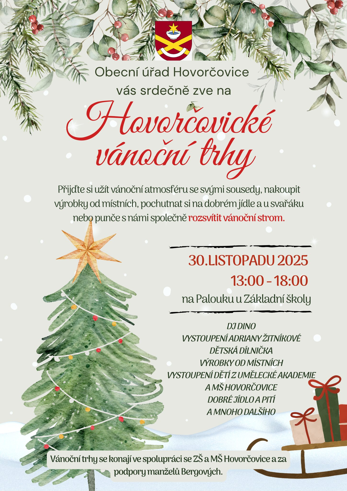 30. listopadu 2025Rozsvícení vánočního stromu 2025Přijďte v neděli 30. 11. 2025 od 13:00 do 18:00 si na Hovorčovické vánoční trhy užít sváteční atmosféru, podpořit místní prodejce, dát si něco dobrého a společně s námi, OÚ Hovorčovice a spolkem MROŠ rozsvítit vánoční strom na palouku u naší základní školy. Více najdete v letáčku