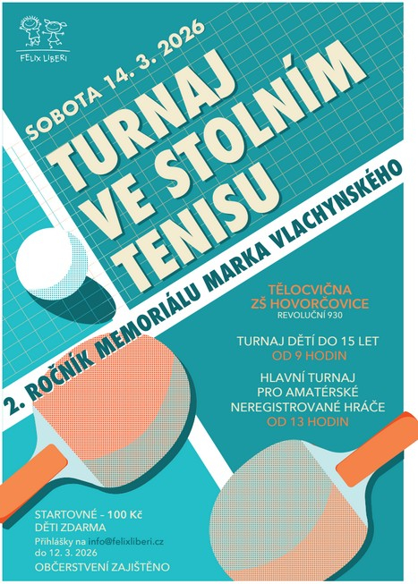 14. března 2026Memoriál Marka VlachynskéhoZveme Vás na 2. ročník Turnaje ve stolním tenisu - Memoriál Marka Vlachynského, který se v prostorách naší TV haly uskuteční v sobotu 14. 3. 2026 od 9:00 pro dětské hráče a od 13:00 pro amaterské neregistrované hráče. Více informací naleznete v letáčku