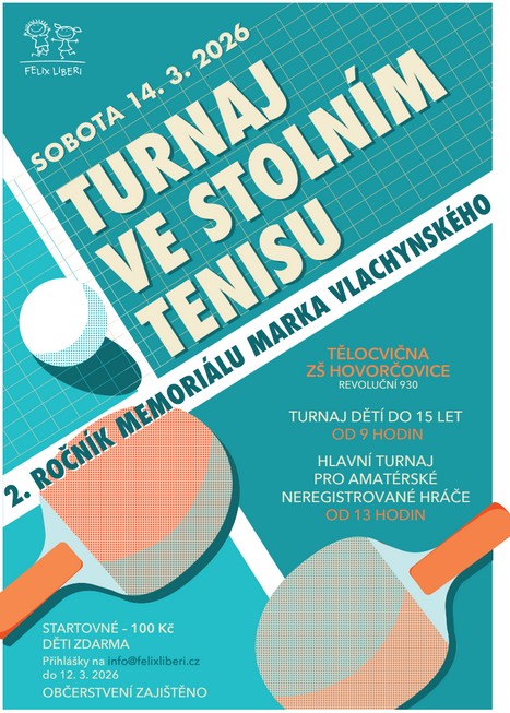 Zveme Vás na 2. ročník Turnaje ve stolním tenisu - Memoriál Marka Vlachynského, který se v prostorách naší TV haly uskuteční v sobotu 14. 3. 2026 od 9:00 pro dětské hráče a od 13:00 pro amaterské neregistrované hráče. Více informací naleznete v letáčku zde nebo na webových stránkách pořadatele Felix Liberi.